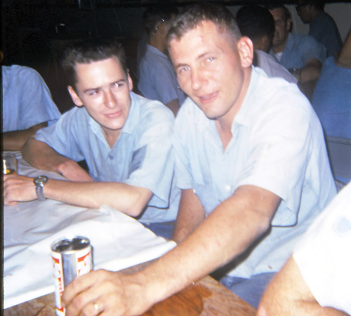 in ball cap and arm around ET3 Jim Verhille. ID by Jim Verhille
